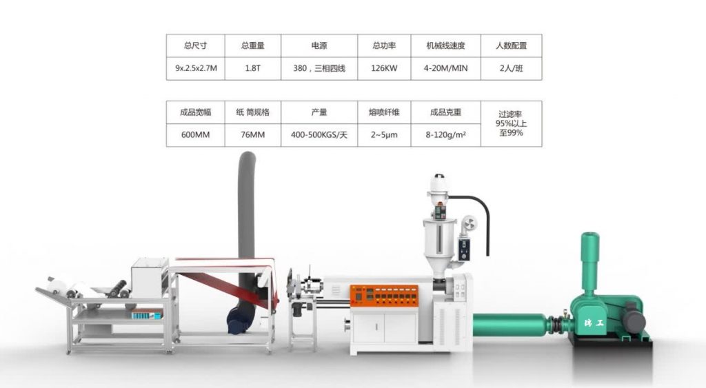 三,喷丝模头。这个是熔喷布机的最重要部位。有1块长条形喷丝板,板上布满一长列喷丝孔,一般每m长约有1500个喷孔。喷丝板两侧面装有热空气喷管,下装有热空气喷孔,与喷丝孔成50b角,使纤维喷出之后,即刻用高速热空气进行气流拉伸,把纤维吹断,成为超细纤维。 产线都会有配,设计和精度直接影响拉丝的长度、均匀性、韧性、细度等诸多方面,从而对最终的卷材质量产生决定性影响。