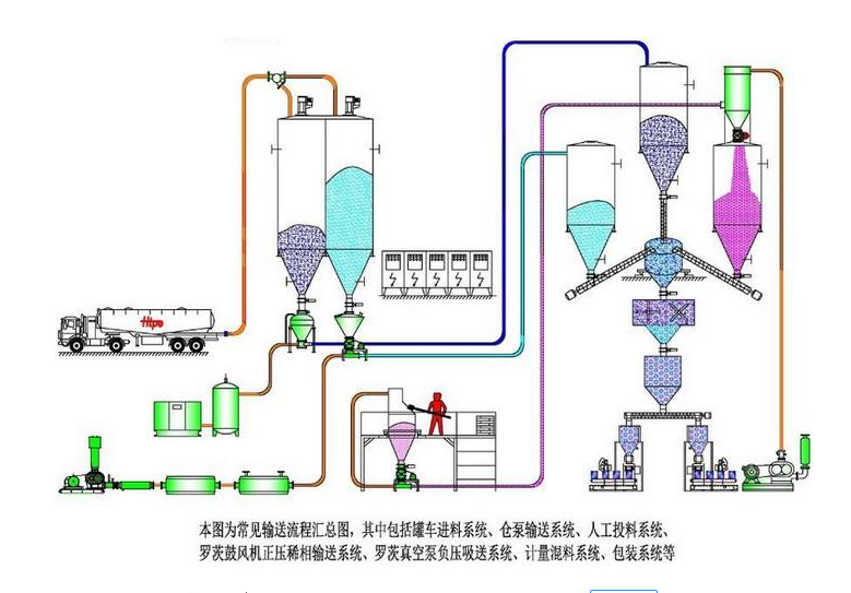 混合系统结合了正、负压系统各自的优点,在该系统中,负压部分把物料从多个喂料仓中吸走,而正压部分把物料送入多个卸料仓。气源靠一台通风机或鼓风机提供。