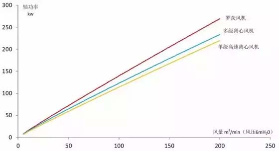 从上图中可知,在风机的效率方面单级高速离心风机最高,多级离心风机其次,罗茨风机最低。同样的供风量,罗茨风机能耗最高,单级高速离心风机能耗最低。