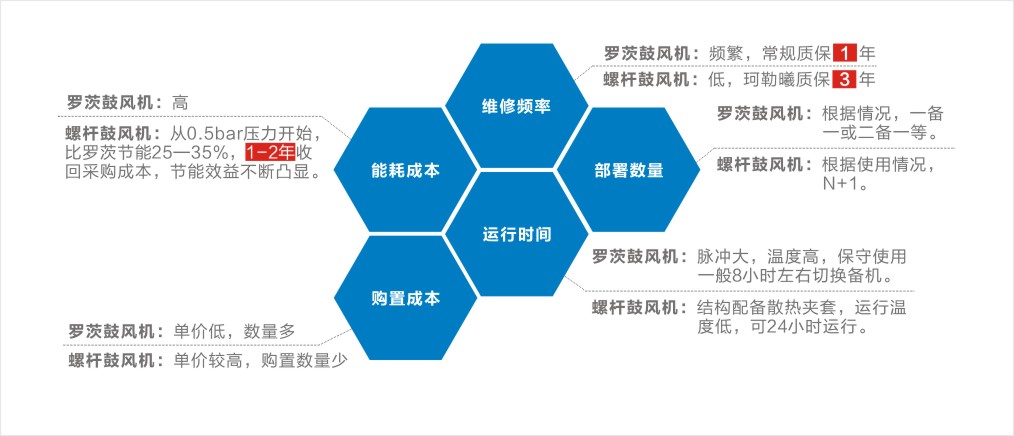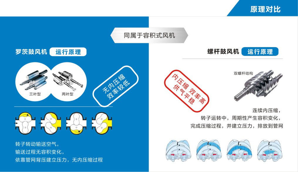 罗茨风机和螺杆鼓风机都是属于容积式风机,如果两者要进行比较的话,可以简单归结为压缩原理的不同,螺杆鼓风机的节能、稳定、低噪优势更为突出。
