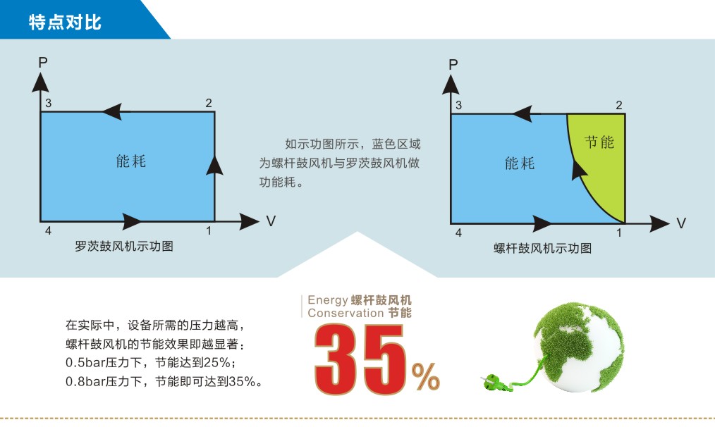 双螺杆鼓风机是传统罗茨和螺杆机型的衍伸机型,具有传统罗茨风机强制送风的特点,螺杆式机型具有一定自压缩,通过过量吸入达到超高的容积效率,双螺杆鼓风机采用的内压缩所需功耗要远远低于罗茨鼓风机采用的外压缩,而且内压缩过程是连续渐进的,气流脉动要低于罗茨鼓风机,所以螺杆鼓风机的噪音及稳定性也均优于罗茨鼓风机。不啰嗦了,用图说话。