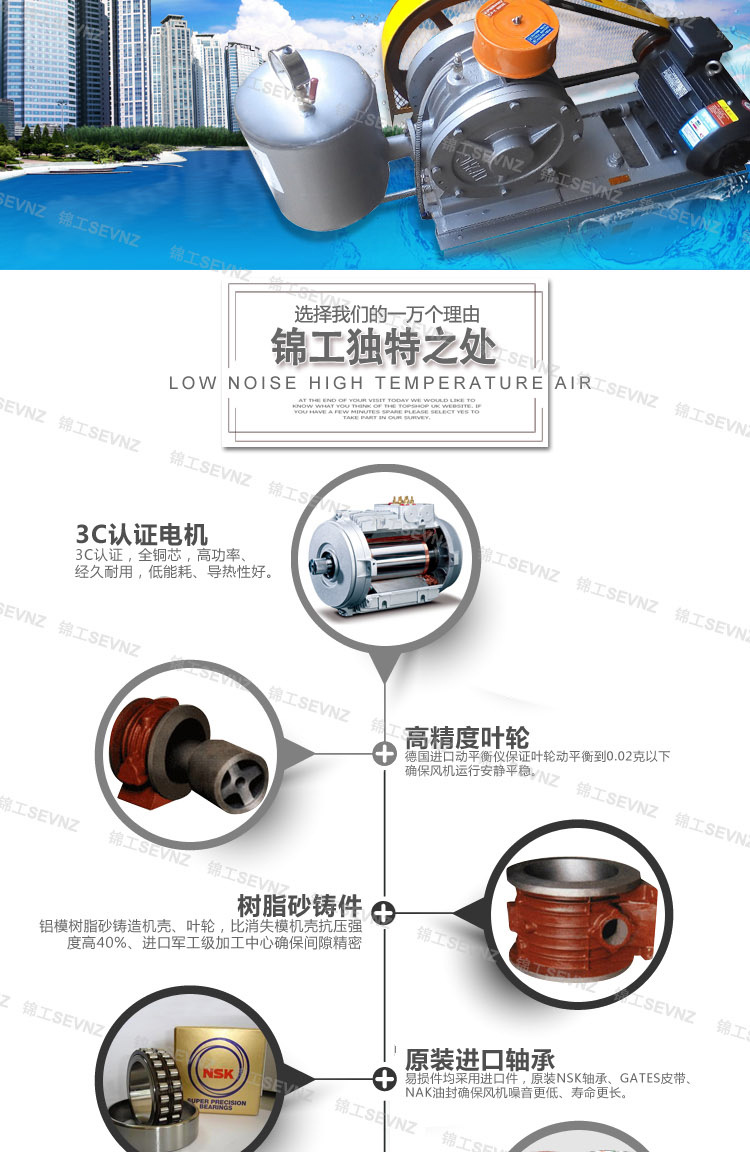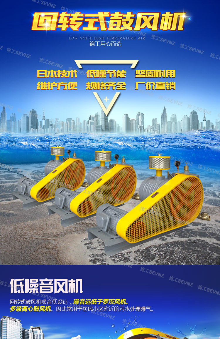 回转式风机是变容压缩,其主要特点是:低转速,低噪音,低振动,高效率,高节能。