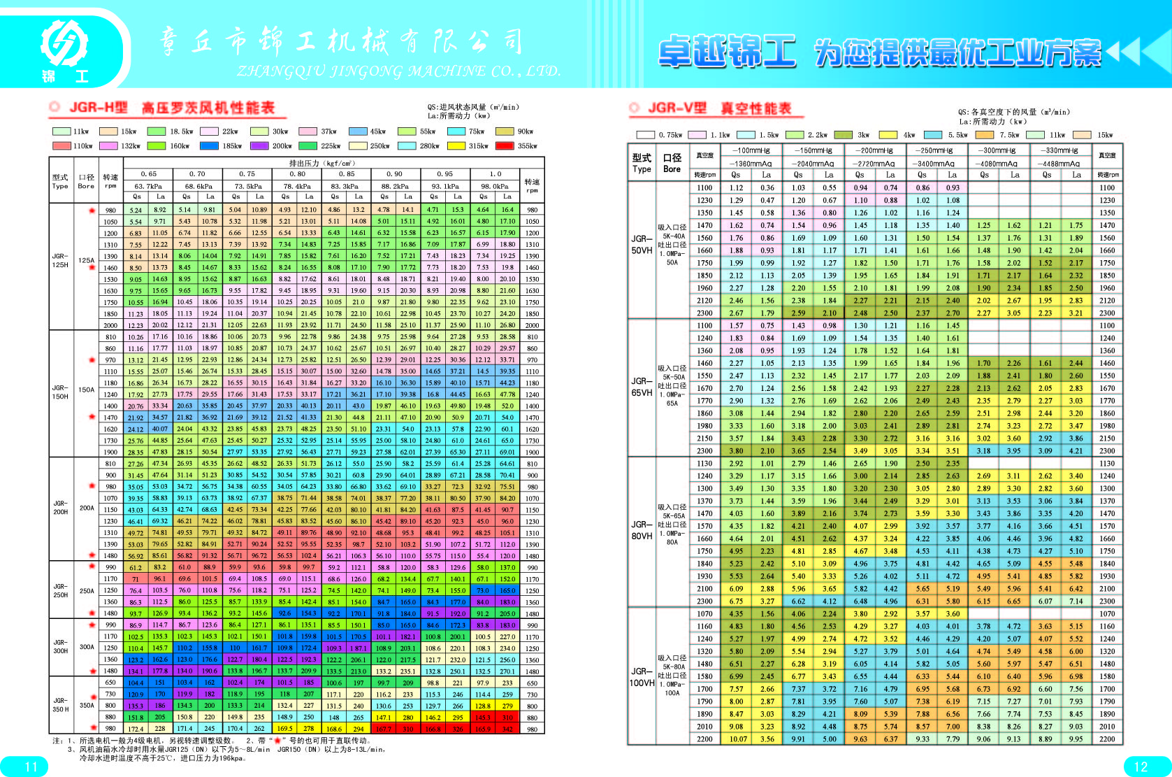 根据得出的风量、风压参照选型参数表确定功率。罗茨鼓风机的电机功率大小有1.5、2.2、3.7、5.5、7.5、11kw等等。