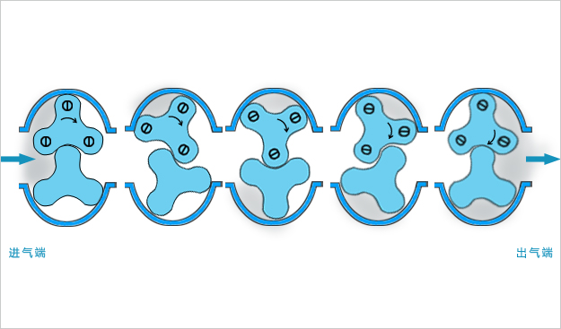 罗茨风机有两个叶轮(图二,圈中部分),在电机带动下,两个叶轮会相向转动,当叶轮转过进气口之后,两个叶轮和墙板及机壳之间会形成一个密封的腔室,叶轮继续转动,密封腔室里面的空气会被压入排气口,如此反复经过进气口和排气口,将外界空气输送至目的地。