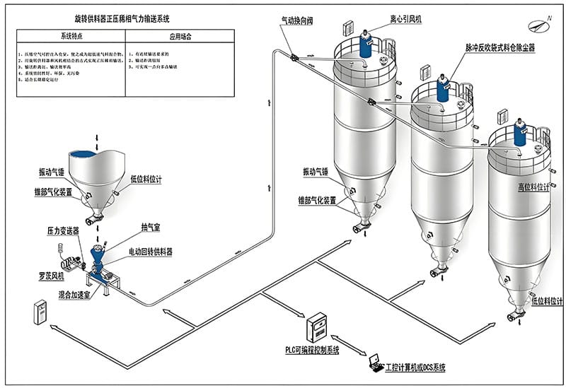 仓泵可以实现理想中的远距离气力输送。目前,在国内的案例中,输送距离超过2000米以上并且稳定运行的只有浓相气力输送系统。